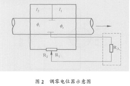 在污水電磁流量計變送器的結(jié)構(gòu)中,應使閉環(huán)的平面與交變磁力線保持平行,以避免磁力線通過閉環(huán),并應設(shè)置千擾調(diào)節(jié)機構(gòu),以減少千擾。干擾信號ET。另外,在變壓器干式饋線上設(shè)置零電位器。如圖2所示。兩根導線從一個電極引出,分別繞過磁極形成兩個回路。當磁力線被共同保護以通過閉合回路時,有必要在兩個回路中沿相反的方向產(chǎn)生感應電勢。因此,在兩個回路中存在相反方向的電流I1和I2。通過調(diào)節(jié)零電位器,R輸入上兩個電路中的電流I1和I2產(chǎn)生的電位相互抵消,以減少90°干擾信號。