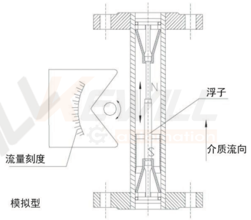 就地顯示型 | 由就地指示器中的隨動磁鋼與浮子內磁鋼耦合;而發生轉動,同時電動指針。通過刻度盤指示出此時流 量大小。(如下圖所示) |