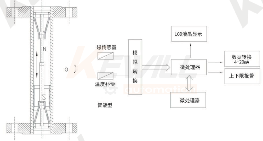 由智能型指示器中的隨動磁鋼與浮子內磁鋼耦合,而發生轉動,同時帶動傳感磁鋼及指針,通過一個磁 傳感器將磁場變化轉化為電信號,經A/D轉化,數字濾波,溫度補償,微處理器處理,D/A輸出,LCD液晶顯示,來顯示出瞬時流量及累積流量大小。(如下圖所示)