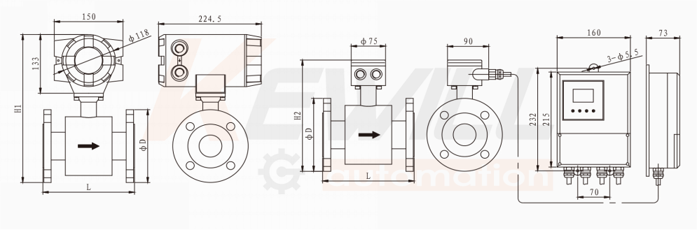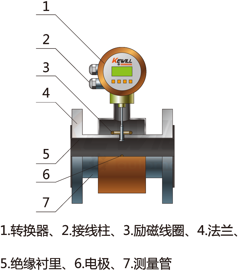 測(cè)量流量時(shí),導(dǎo)電性液體以速度V流過垂直于流量方向的磁場(chǎng),導(dǎo)電性液體的流動(dòng)感應(yīng)出一個(gè)與平均流速成正比的電壓,其感應(yīng)電壓信號(hào)通過二個(gè)或二個(gè)以上與液體直接接觸的感應(yīng)電極檢出,并通過電纜送至轉(zhuǎn)換器通過其智能化處理,實(shí)現(xiàn)流體瞬時(shí)流量、積累流量的顯示及流量數(shù)據(jù)與控制系統(tǒng)之間的通訊。測(cè)量管內(nèi)無活動(dòng)及阻流部件,因此幾乎沒有壓力損失,并且有很高的可靠性。