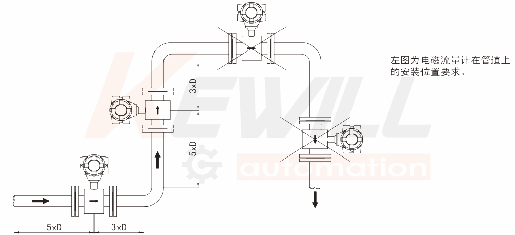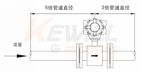 為了在不同的應(yīng)用條件下確保說明書所表述的精度,安裝傳感器時(shí)應(yīng)從電極面上游安裝五倍管徑的直管段,下游安裝三倍管徑的直管段,見下圖所示。這種安裝可以充分排出由于彎管、閥門或縮頸引起的干擾。當(dāng)流量計(jì)前后的直管段不能滿足要求時(shí),性能指標(biāo)會(huì)有一定偏差。