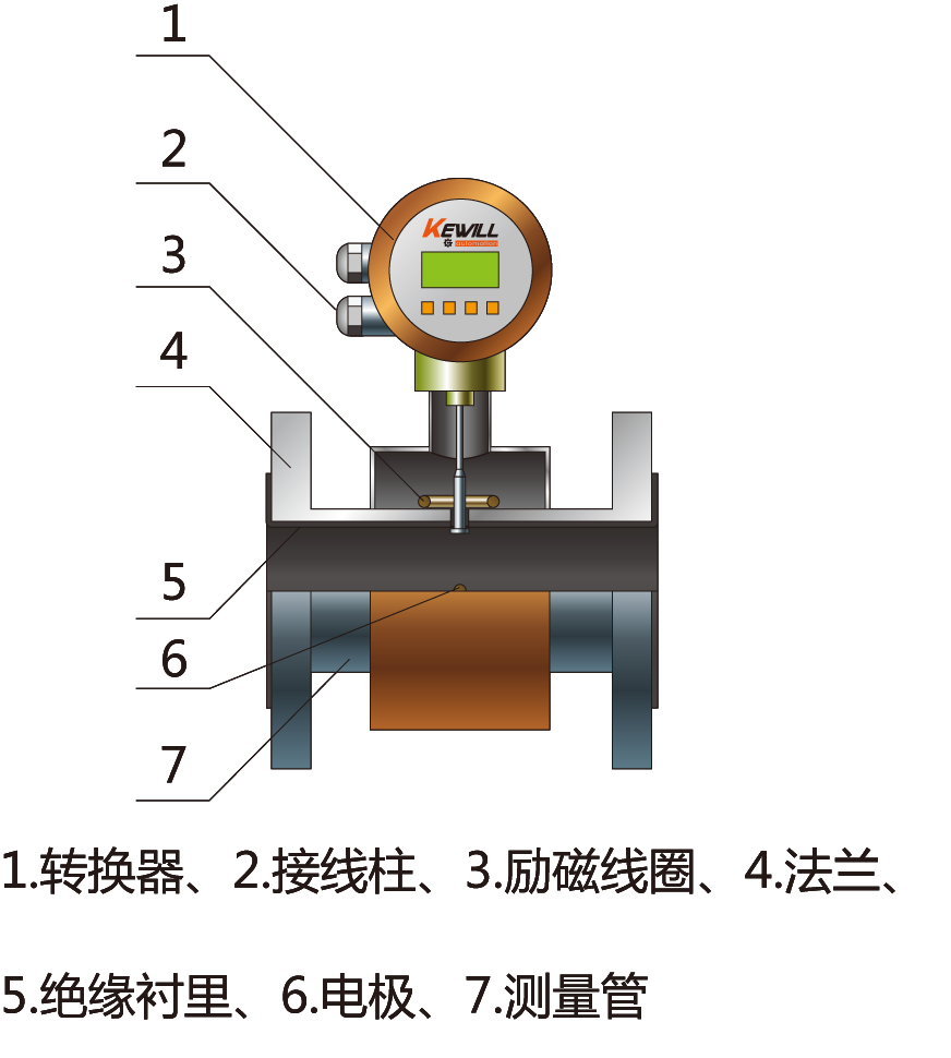 測量流量時,導電性液體以速度V流過垂直于流量方向的磁場,導電性液體的流動感應出一個與平均流速成正比的電壓,其感應電壓信號通過二個或二個以上與液體直接接觸的感應電極檢出,并通過電纜送至轉換器通過其智能化處理,實現流體瞬時流量、積累流量的顯示及流量數據與控制系統之間的通訊。測量管內無活動及阻流部件,因此幾乎沒有壓力損失,并且有很高的可靠性。