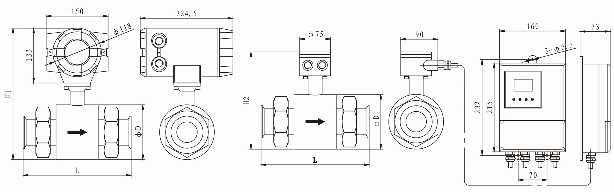 分體型是電磁流量計較普遍的應用形式。傳感器單獨接在工藝管道上,轉換器安裝在相距數米或百余米的其他地方,中間用電纜相連接。分體型的流量計可以使得轉換器遠離環境比較惡劣的現場,也便于觀測和調整設定的參數。