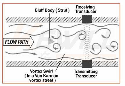 渦街流量計是利用卡門渦街原理進行測量的,在測量管中垂直插入一個柱狀物,流體通過柱狀物時,一定條件下,在柱狀兩側就會交替產生兩列有規則的旋渦,如下圖所示意,這兩列旋
