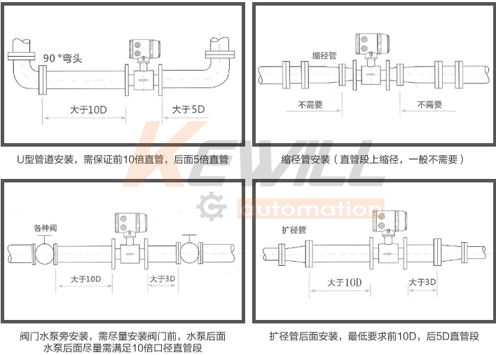 ●由于感應電壓信號時在整個充滿磁場的空間中形成的,是管道截面上的平均值,因此傳感器所需要的直管段較短,一般為前5D后3D
