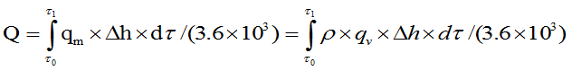 式中: Q-系統(tǒng)釋放或吸收的熱量,單位為KWh; qm-流經(jīng)熱量表的水的質(zhì)量流量,單位為kg/h; qv-流經(jīng)熱量表的水的體積流量,單位為m3/h; ρ-流經(jīng)熱量表的水的密度,單位為kg/m3; △h-在熱交換系統(tǒng)進(jìn)口和出口溫度下水的焓值差。單位為kJ/kg; τ-時(shí)間,單位為h.