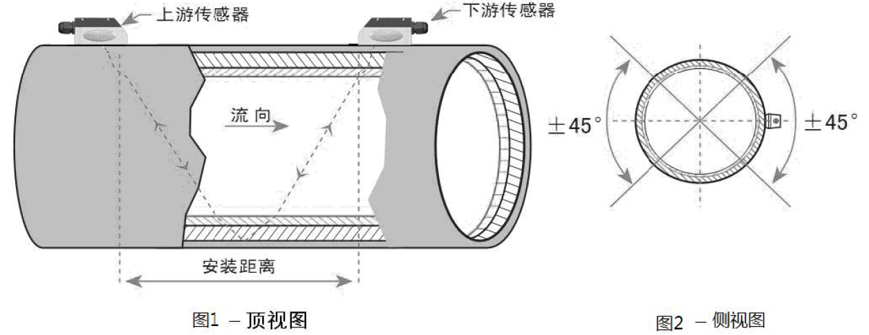 為保證超聲波流量計的測量精度和穩定性,測量點處的流體必須充滿管段(否則會導致測量值過大或無法測量)。 因此,應滿足以下條件:兩個傳感器應安裝在管道軸向平面的水平方向,如圖1所示的外殼內。 2、防止管內脹氣、上部氣泡或下部沉淀等現象影響傳感器的正常測量。