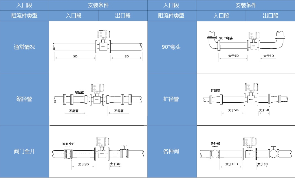 1、智能電磁流量計傳感器安裝位置要求前后有一定長度的直管段,保證暢通,上游一般要求(90°彎頭、三通管、同心異徑管、閘閥全??開后)直管長度為5D,閥門不同開度為10D,下游直管為2~3D傳感器內徑(D);