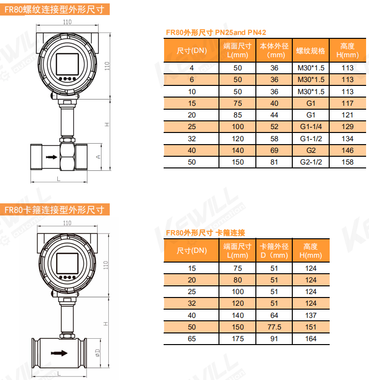 FR80-AC | 電源:AC 86 to 265 V; LCD顯示;帶4 to 20mA輸出、脈沖輸出和RS485通訊;帶高低報警 | 壓鑄鋁 |
